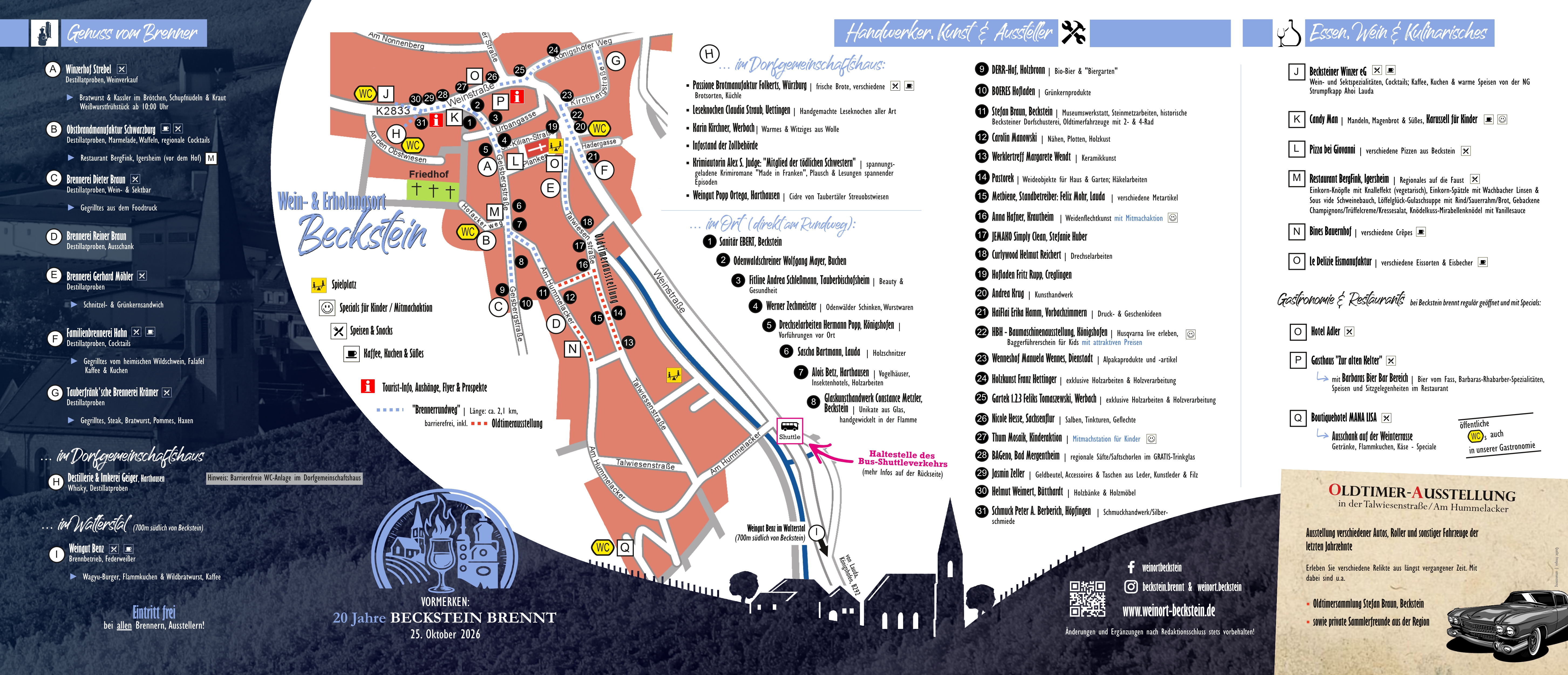 Wie in den vergangenen Jahren findet am Samstag vor Beckstein brennt das "Vorbrennen" mit verschiedenen Weinwanderungen statt. Ebenso öffnen bereits erste Brennereien und Aussteller ihre Pforten.